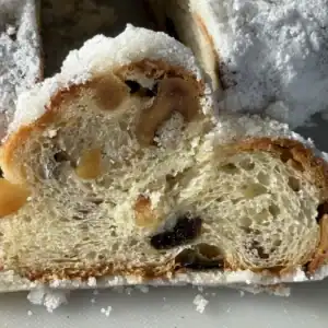 このシュトーレン、クリスマスや新年にかけて、毎日少しずつ食べ進んでいくというお菓子ですが、この小ささをクリスマスまで持たせるほど薄く切る技量は持ち合わせていません。